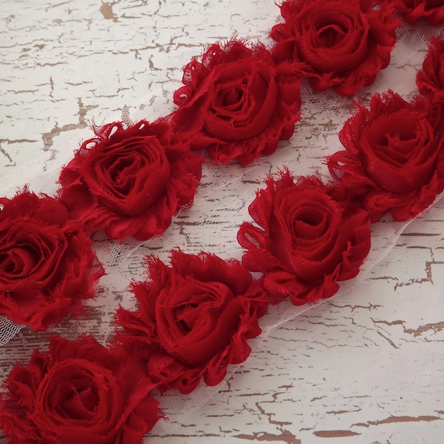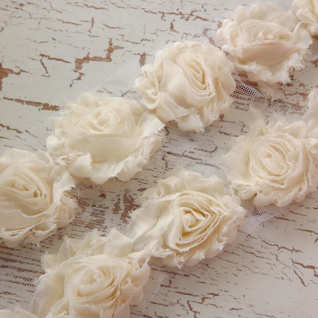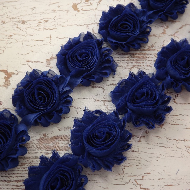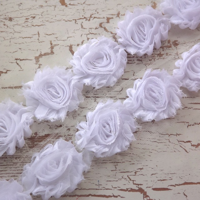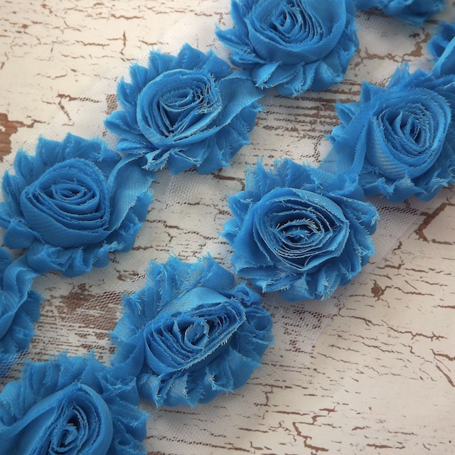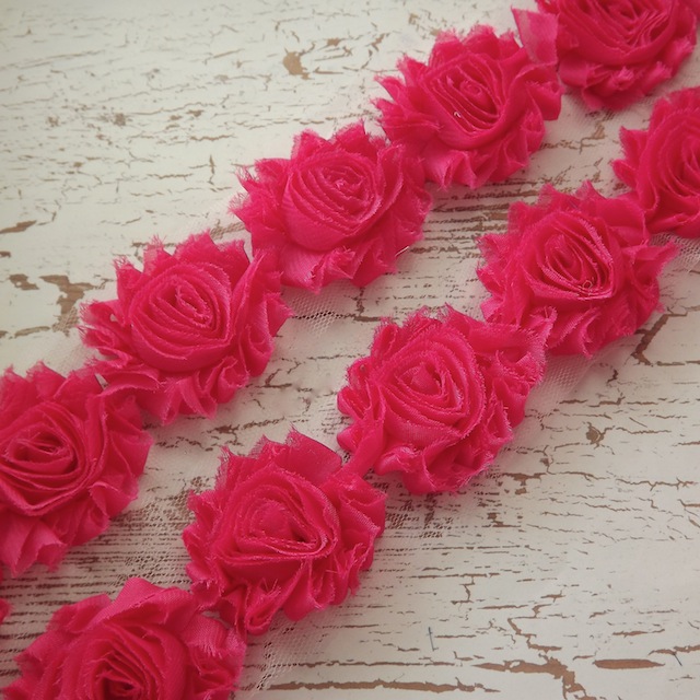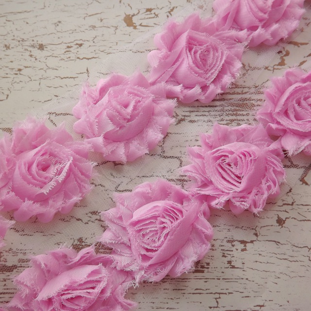 2.5″ polyester flowers on a 1/2 yard on mesh trim. Each half yard contains 7 soft, shabby fabric flowers. These cute, high-quality flowers come ready to trim for all your crafting ideas for headbands, clothes, shoes, or clips, scrapbooking and more. Choose your color.